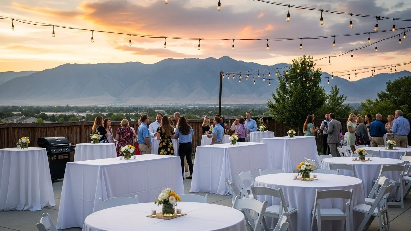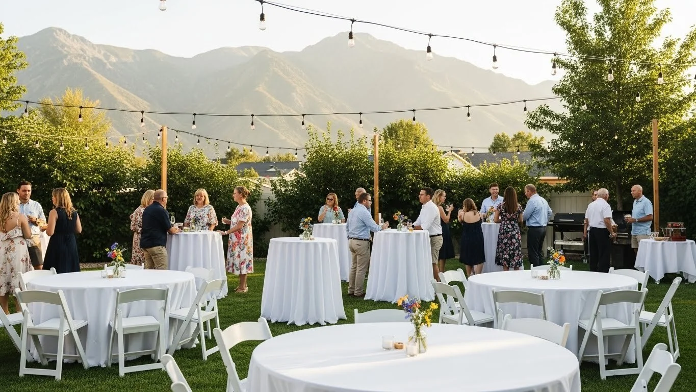 Planning a backyard party in Saratoga Springs? Utah Valley Event Rentals provides everything you need to host a comfortable, memorable event right at home. From tables and chairs to tents, and dance floors, we deliver high-quality equipment directly to your backyard—clean, reliable, and ready for setup.